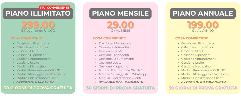 È il piano più conveniente a lungo termine. Include tutte le funzionalità senza limiti di tempo né costi ricorrenti. L’avviamento è gratuito e hai accesso completo a ogni modulo, compresi prenotazioni online, messaggistica WhatsApp e fidelizzazione clienti.