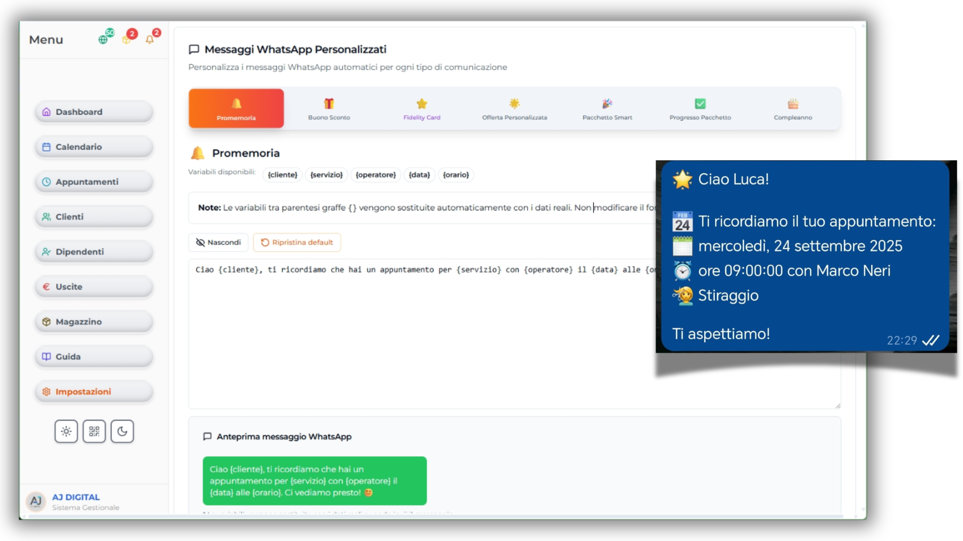 Resta sempre in contatto con i tuoi clienti. Conferme, promemoria e promozioni direttamente su WhatsApp. Comunicazione istantanea, risultati immediati.