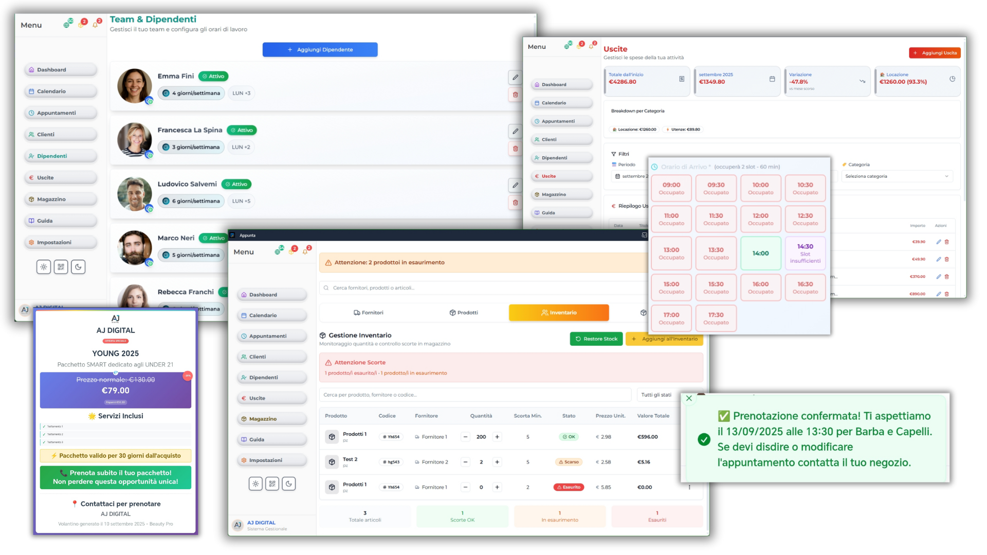 Tantissime altre funzionalità ti aspettano dentro Appunta, Gestione Dipendenti e Collaboratori, Magazzino, Inventario, Fornitori, Uscite.....e molto altro!!!